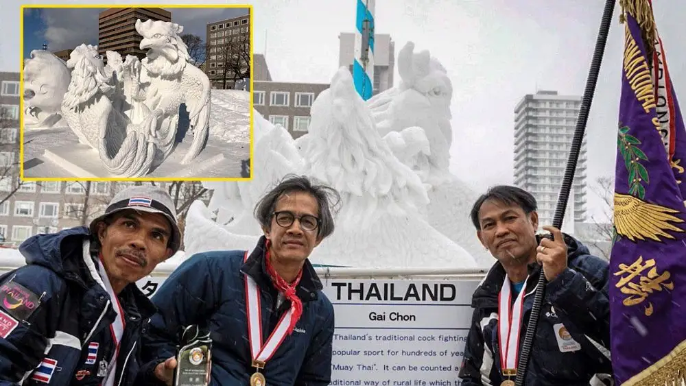ผลงานการแกะสลักหิมะเป็นรูป “ไก่ชน” คว้ารางวัลชนะเลิศที่ญี่ปุ่น