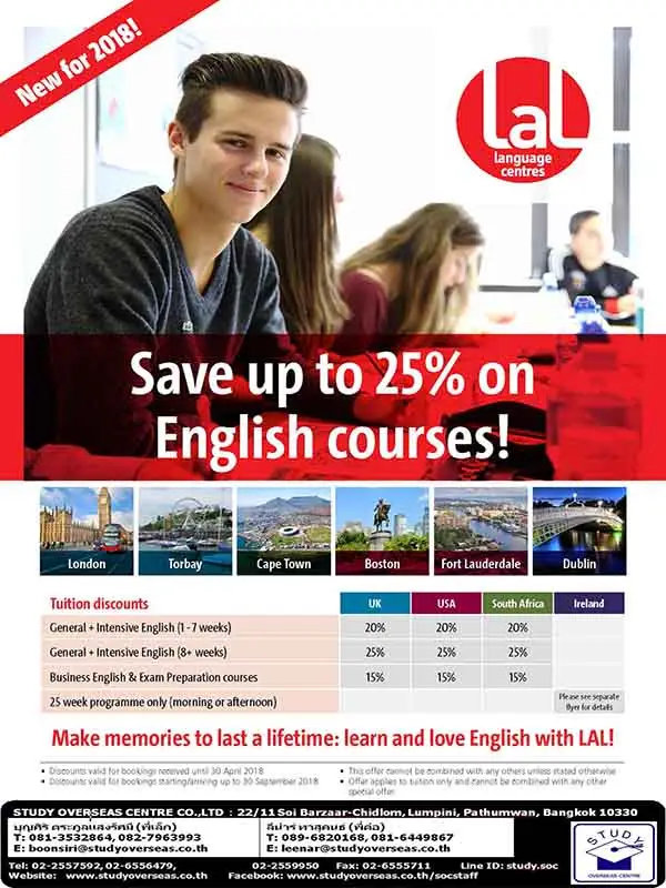 LAL Language Centre สถาบันสอนภาษามากประสบการณ์ใน 5 ประเทศทั่วโลก เปิดโปรลดค่าเรียนภาษา 25% สำหรับเรียนภาษาที่เมืองสำคัญของประเทศอังกฤษ (London, Torbay) อเมริกา (Boston, Fort Lauderdale) แอฟริกาใต้ (Cape Town) และไอร์แลนด์ (Dublin)