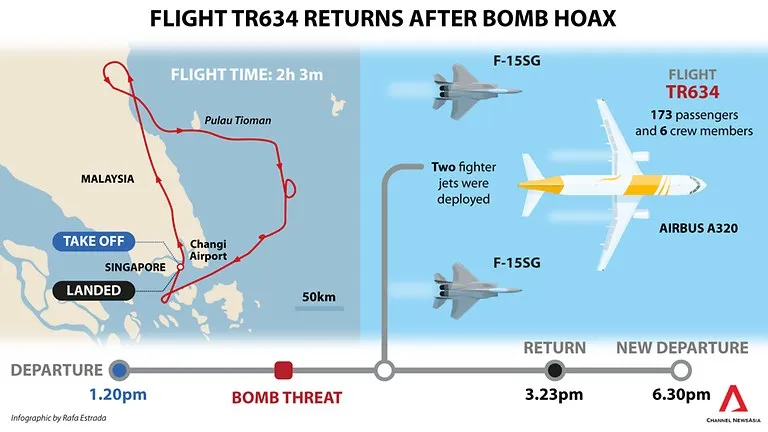 เที่ยวบิน TR634 บินจากสิงคโปร์ เมื่อเวลา 13.20 น. กำลังมุ่งหน้าหาดใหญ่ ซึ่งมีผู้โดยสาร 173 คน และลูกเรือ 6 คน ถูกขู่วางระเบิด ทำให้ต้องบินกลับฉุกเฉินมายังสนามบินชางงีของสิงคโปร์ ในเวลา 15.23 น. โดยมีเครื่องบินขับไล่แบบ F-15SG ของกองทัพอากาศสิงคโปร์ จำนวน 2 ลำ บินประกบคอยคุ้มกัน จากทะเลจีนใต้