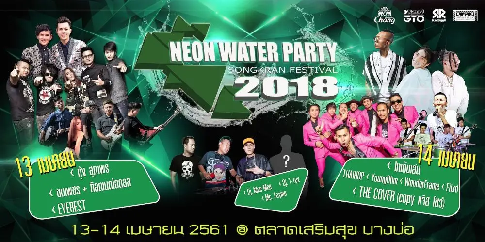ระเบิดความมันส์แบบทะลุมิติ น้ำไม่อั้น เปียกกันถ้วนหน้า ในงาน “NEON WATER PARTY SONGKRAN FESTIVAL 2018” โดยกิจกรรมภายในงานพบกับศิลปิน “กุ้ง-สุภาพร”, “ขนเพชร”, “ก๊อต-เนตไอดอล” วงTHAIHOP ,YoungOhm, WonderFrame, Fiixd , วงไทเดินเล่น, วงดนตรีสุดแนวแถวหน้า, วงTheCoverCopy แจ๊สโชว์, วงEverrest และเหล่าดีเจชื่อดัง อาทิ “DJMemee”และ “DJT-LEX+MCTaymo” ในวันศุกร์ที่ 13 เมษายน และ วันเสาร์ที่ 14 เมษายน.2561 ตั้งแต่เวลา 17.00-24.00 น. ณ ตลาดเสริมสุข บางบ่อ สมุทรปราการ (หน้าคาร์แคร์) อย่ามัวเฉยเมย อย่ามันส์คนเดียวชวนเพื่อนมามันส์พร้อมกันได้กับโปรโมชั่นบัตรจากราคาปกติ 200 บาท /วัน พิเศษลดเหลือ ราคา 180 บาท/วัน ระหว่าง วันที่ 25 มี.ค.-10 เม.ย. 61 เท่านั้น ช้าหมด อดไม่รู้ด้วย มีจำนวนจำกัด ซื้อล่วงหน้า 2 วัน รับ Wristband VIP ไปใส่เท่ห์ๆ เล๊ยยยวัยสะรุ่น โดย Wristband สีชมพู สำหรับ วันที่ 13/4/2561 (1 วัน), Wristband สีเขียว สำหรับ วันที่ 14/4/2561 (1 วัน), Wristband VIP สีขาว สำหรับ วันที่ 13-14/4/2561 (พิเศษสำหรับผู้ซื้อ2วันเท่านั้น)