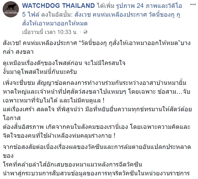 เมื่อวันที่ 6 เม.ย. 61 เพจ “WATCHDOG THAILAND” โพสต์คลิปสุดหดหู่ พระเณรกำลังช่วยกันอุ้มสุนัข ส่งให้กรมปศุสัตว์ทั้งน้ำตา พร้อมกับระบุข้อความว่า “สังเวช! คนห่มเหลืองประกาศ “วัดนี้ของกู กูสั่งให้เอาหมาออกให้หมด”บางกล่ำ สงขลา ดูเหมือนเรื่องดีๆของโพสต์ก่อน จะไม่มีใครสนใจ งั้นมาดูโพสต์ใหม่นี้กันนะครับ เพิ่งจะชื่นชม สัญญาข้อตกลงการทำงานร่วมกันระหว่างอาสาบ้านหมายิ้มหาดใหญ่และเจ้าหน้าที่ปศุสัตว์สงขลาไปแหมบๆ โดยเฉพาะ ข้อสาม…จับเฉพาะหมาที่จับไม่ได้ และไม่มีคนดูแล ! แต่เรื่องเศร้า สลดใจ ที่พิสูจน์ว่า มือที่หยิบยื่นความทุกข์ทรมานให้สัตว์ด้อยโอกาส ต้องสิ้นอิสรภาพ เกิดจากคนในสังคมของเรานี่เอง โดยเฉพาะความคิดและจิตใจของคนที่ใช้ผ้าเหลืองห่มคลุมร่างกาย !