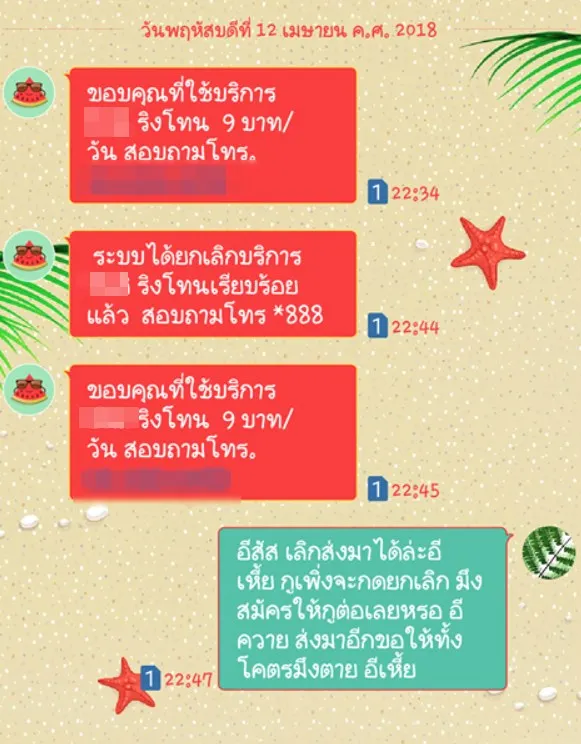 ใครเจอแบบนี้มั่งมาระบายกันหน่อย คนหนุ่มคนสาวเจอ ยังวุ่นวายกว่าจะยกเลิก sms ได้ แล้วลองคิดดูว่าถ้าคนเฒ่าคนแก่โดนเข้า แก้ไม่เป็น โดนซักเดือนละหมื่นคนแสนคน จะเป็นเงินขนาดไหน