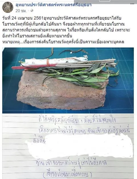 เฟซบุ๊กเพจ อุทยานประวัติศาสตร์พระนครศรีอยุธยา ได้โพสต์เรื่องราวระบุว่า ทางอุทยานประวัติศาสตร์ฯ ได้รับคืนโบราณวัตถุเป็นอิฐก่อนหนึ่ง ที่มีนักท่องเที่ยวเก็บไปจากวัดไชยวัฒนาราม จ.พระนครศรีอยุธยา