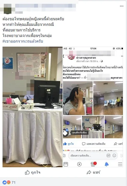 เพราะพยาบาลคนนั้นเขาลงเวรแล้ว มาเคลียร์ของที่โต๊ะกำลังจะปิ๊กบ้าน แต่ไอ้นี่ไม่รู้ นึกว่าเธอนั่งอู้ ไม่บริการตัวเอง เลยถ่ายภาพมาลงประจานในกลุ่มแม่งเลย
