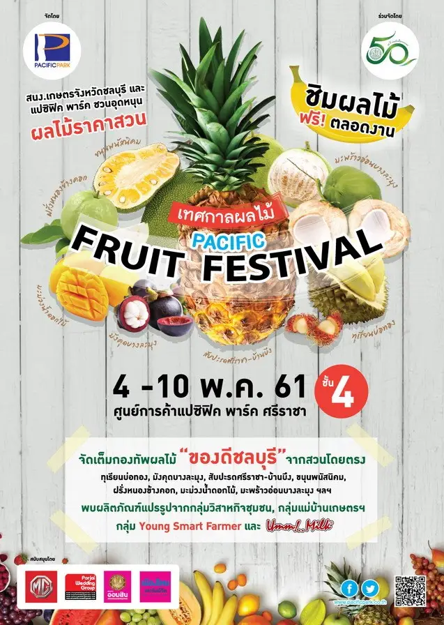 สำนักงานเกษตรจังหวัดชลุรี และแปซิฟิค พาร์ค ศรีราชา ชวนเที่ยวงาน Pacific Fruit Festival เทศกาลผลไม้ จัดเต็มกับกองทัพผลไม้ ของดีชลบุรี คุณภาพดี ราคาถูก จากสวนโดยตรง อาทิ ทุเรียนบ่อทอง ,มังคุดบางละมุง ,สับปะรดศรีราชา – บ้านบึง ,ขนุนพนัสนิคม ,ฝรั่งหนองข้างคอก ,มะม่วงน้ำดอกไม้ ,มะพร้าวบางละมุง ฯลฯ พบกับผลิตภัณฑ์แปรรูปจากกลุ่มวิสาหกิจชุมชน ,กลุ่มแม่บ้านเกษตรฯ ,กลุ่ม Young Smart Farmer และ Umm!..Milk พร้อมชิมผลไม้ฟรี! ตลอดงาน ระหว่างวันที่ 4 – 10 พฤษภาคม 2561 ณ ชั้น 4 หน้าแปซิฟิคฮอลล์ ศูนย์การค้าแปซิฟิค พาร์ค ศรีราชา