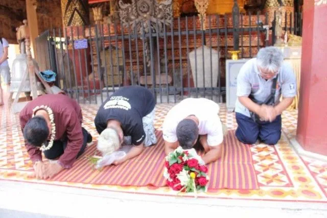 สำหรับความคืบหน้า เมื่อช่วงเย็นวันที่ 5 พ.ค. ส.ต.นพดล เครือนพรัตน์ อดีตประธานชมรมร่มบินลำปาง ที่ได้รับการประสานจากประธานชมรมร่มบินเชียงใหม่ ได้พานายวิคเตอร์ รอค ดิเกรซ อายุ 33 ปี พร้อมเพื่อนชาวสเปน ซึ่งเป็นนักท่องเที่ยวจากสเปน ซึ่งเป็นผู้ขับเครื่องพารามอเตอร์ขึ้นบินดังกล่าว มาขอขมาต่อองค์พระธาตุลำปางหลวงและสิ่งศักดิ์สิทธิ์ โดยนักท่องเที่ยวทั้ง 2 คนได้นำดอกไม้และธูปเทียนมาขอขมาด้วย ก่อนที่นายสมจิตร ทิพย์แก้ว อายุ 56 ปี อาจารย์ล้านนาประจำหมู่บ้านลำปางหลวง จะเป็นผู้นำทั้งสองคนขอขมา ซึ่งทั้งสองคนก็ทำอย่างตั้งใจ ด้วยการพนมมือแล้วกราบลงกับพื้น เพื่อเป็นการขอขมา ก่อนเดินรอบองค์พระธาตุลำปางหลวง 3 รอบ เพื่อเป็นการขอขมาและถวายเป็นพุทธบูชา