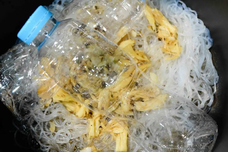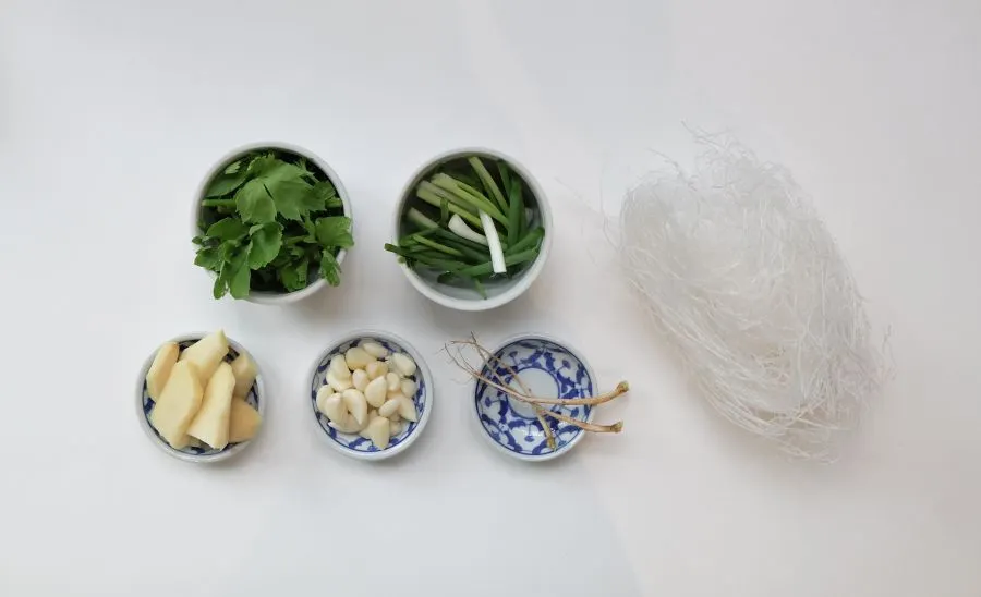 1. ตัดวุ้นเส้นเป็นท่อนแล้วแช่พักไว้ให้นิ่ม