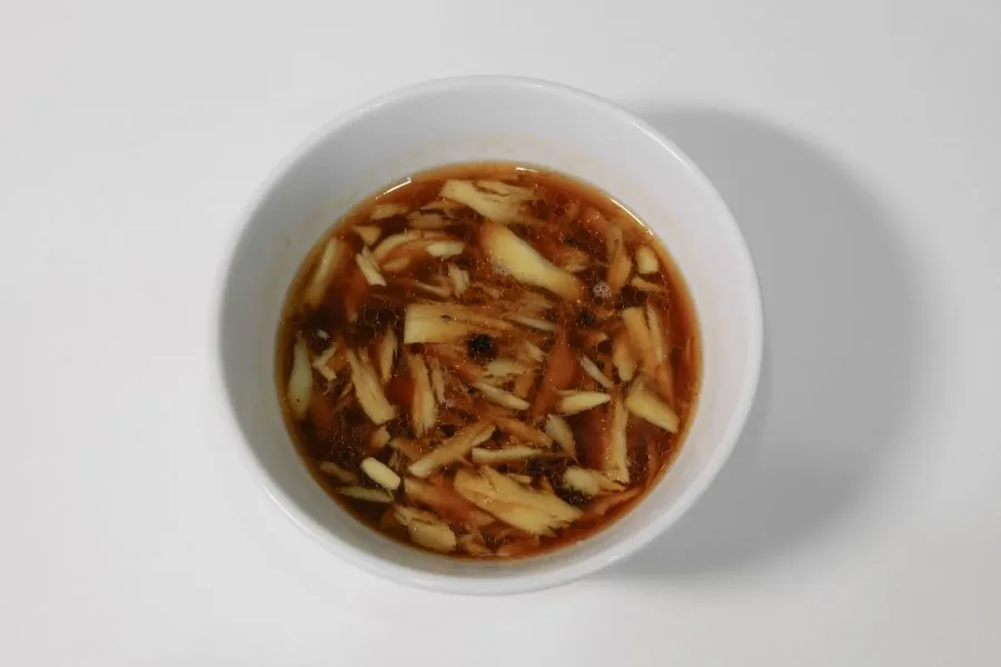 2. ทำน้ำปรุงระหว่างรอ โดยการโขลกขิงแก่และกระเทียม บุบพริกไทย พอแหลก แล้วผสมรวมกับน้ำมันหอย ซิสแรุงรส น้ำตาลทราย น้ำมันงา น้ำเปล่า พริกไทยบุบ แล้วคนให้ละลายเข้ากัน