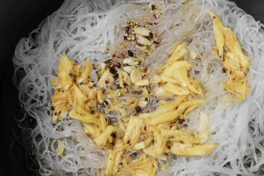 5. นำวุ้นเส้นที่แช่ไว้ใส่ตามลงไปพร้อมเครื่องปรุง