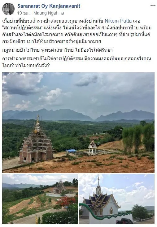 "เมื่อบ่ายนี้ขับรถสำรวจป่าสงวนแถวภูเขาหลังบ้านกับ Nikom Putta เจอ “สถานที่ปฏิบัติธรรม” แห่งหนึ่ง ไม่แน่ใจว่าชื่ออะไร กำลังก่อปูนทำป้าย พร้อมกับสร้างอะไรต่อมิอะไรมากมาย ควักดินภูเขาออกเป็นแถบๆ ที่ถ่ายรูปมานี่แค่กระผีกเดียว เขาได้เงินบริจาคมาสร้างนู่นนี่มากมาย