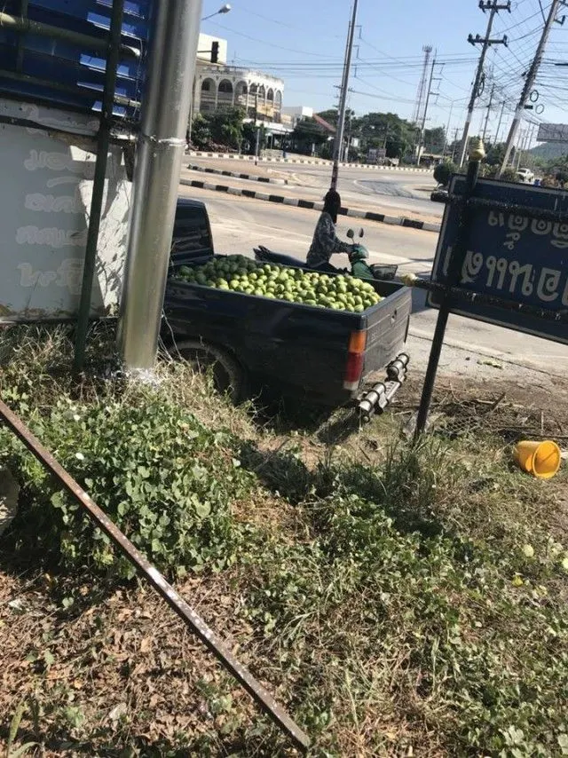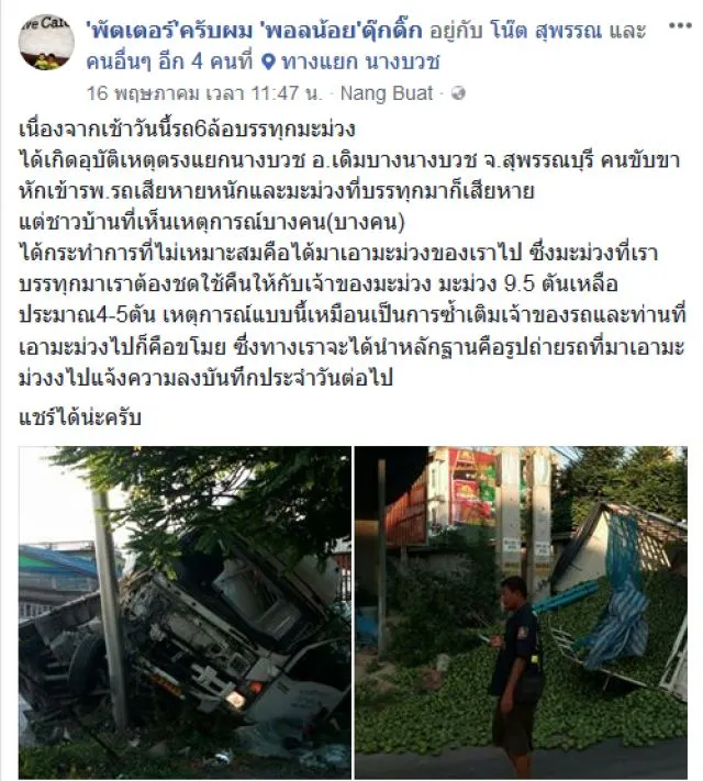 ได้เกิดอุบัติเหตุตรงแยกนางบวช อ.เดิมบางนางบวช จ.สุพรรณบุรี คนขับขาหักเข้ารพ.รถเสียหายหนักและมะม่วงที่บรรทุกมาก็เสียหาย