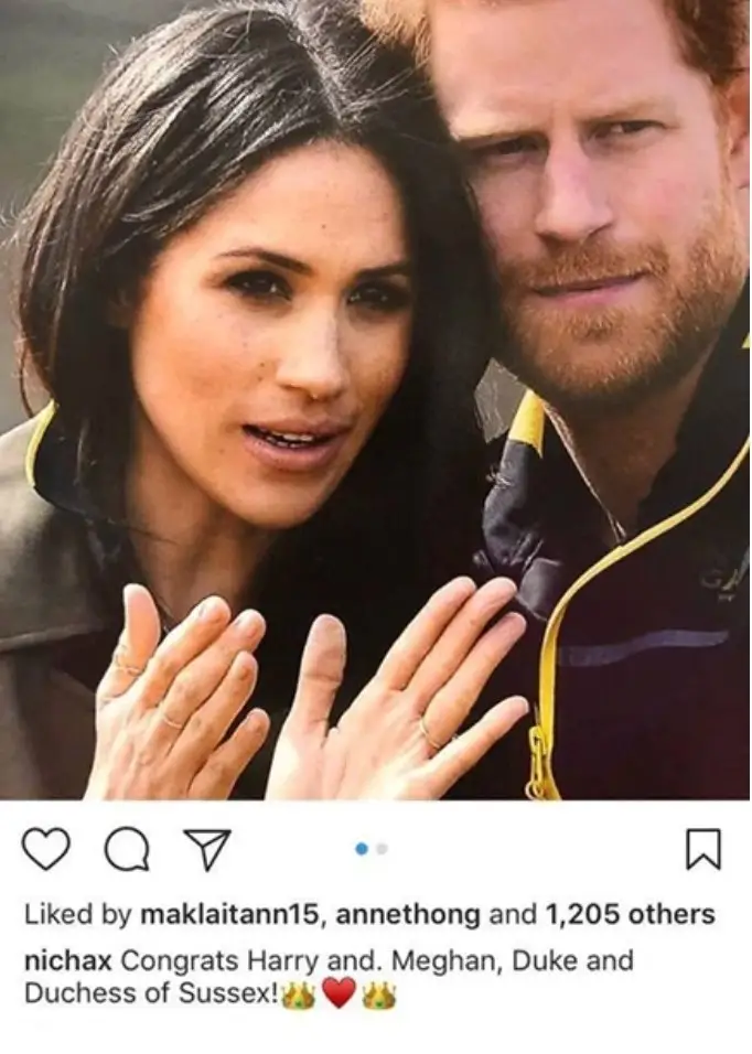 โดยพระองค์ทรงโพสต์ภาพพร้อมข้อความว่า “Congrats Harry and Meghan, Duke and Duchess of Sussex!”