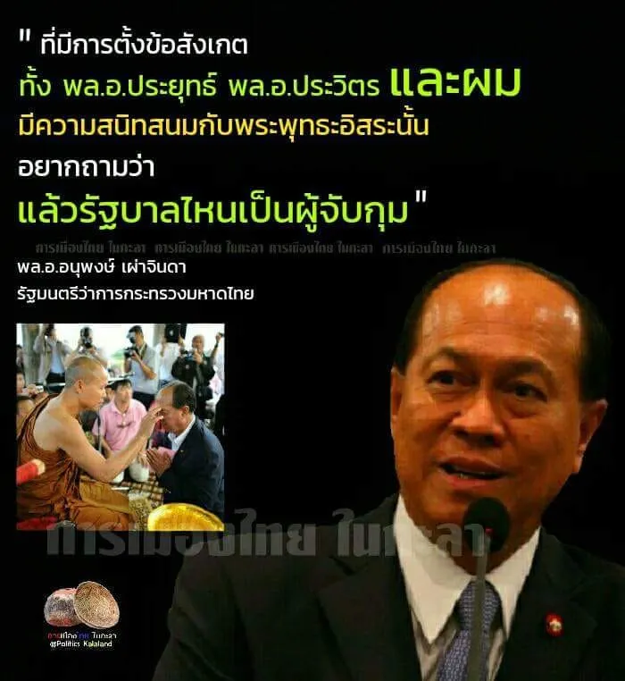 พล.อ.อนุพงษ์ เผ่าจินดา รัฐมนตรีว่าการกระทรวงมหาดไทย กล่าวถึงกรณีที่มีการจับกุมอดีตพระพุทธะอิสระ ว่า ในด้านของพุทธศาสนาถือเป็นเรื่องที่กระทบกระเทือนจิตใจประชาชนจำนวนมาก ตนก็รู้สึกเสียใจ ไม่มีใครอยากให้เกิดเหตุการณ์นี้ขึ้น แต่เรื่องนี้ต้องยอมรับว่าเป็นเรื่องที่เกี่ยวข้องกับกฎหมาย จะไปทำอย่างไรได้ ก็ต้องว่ากันไปตามกฎหมาย ไม่ว่าจะเป็นนักการเมือง หรือพระสงฆ์ก็ต้องอยู่ภายใต้กฎหมาย
