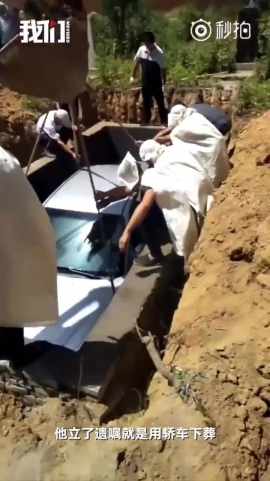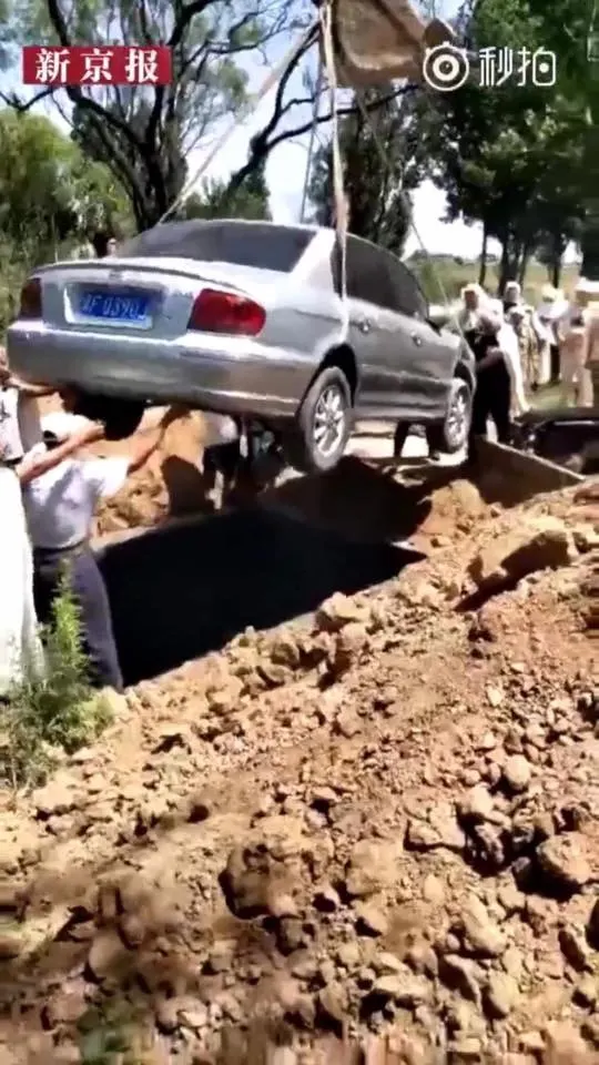 ภาพจากคลิปวีดีโอซึ่งบันทึกเมื่อวันจันทร์ (28 พ.ค.) เผยให้เห็นรถตักดินค่อยๆ หย่อนรถเก๋งสีเทารุ่นเก่าลงในหลุมสี่เหลี่ยม ท่ามกลางเสียงดนตรีและปะทัดของพิธีฝังศพตามธรรมเนียมจีน