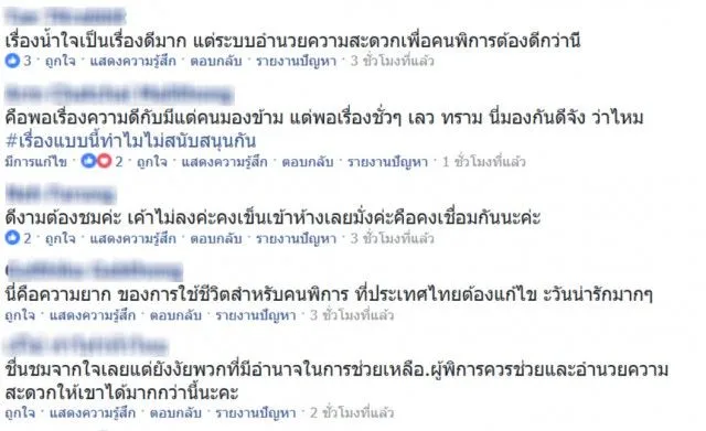 สิ่งอำนวยความสะดวกสำหรับผู้พิการในประเทศไทย ถือว่ามีการพัฒนาไปมากกว่าแต่ก่อน เช่น ห้องน้ำ ที่จอดรถรถ สถานบริการต่างๆ ที่มีช่องทางพิเศษสำหรับคนพิการมากมาย แต่สำหรับการคมนาคมขนส่ง หรือการเดินทาง ก็ยังมีข้อด้อยอยู่มากเช่น ฟุตปาธหรือทางเท้าที่มีปุ่มสัมผัสสำหรับผู้พิการทางสายตา ที่ยังไม่ทั่วถึง รวมทั้ง ทางข้ามถนน สำหรับผูพิการหรือผู้ป่วยที่ไม่สามารถเดินได้