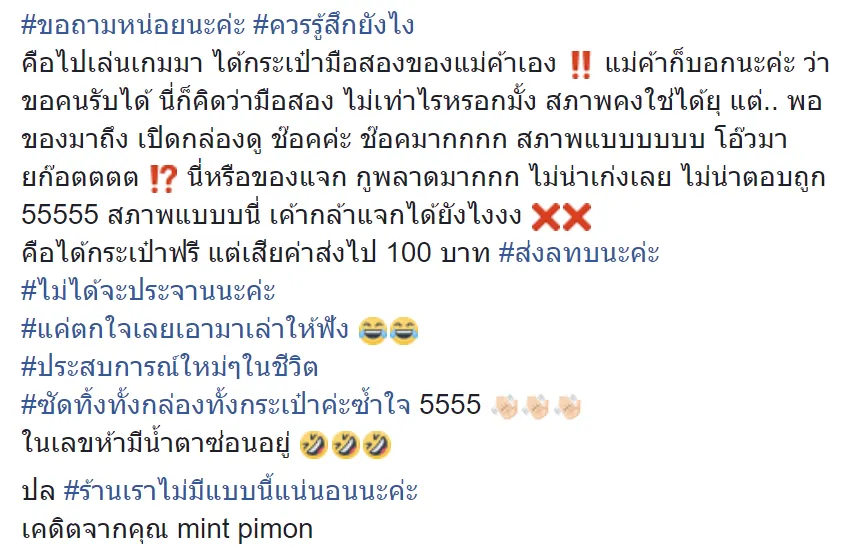 คุณผู้หญิงท่านหนึ่งได้เล่นเกมตอบคำถามชิงกระเป๋า โดยเธอเป็นผู้ชนะได้ของรางวัลเป็นกระเป๋ามือสอง 1 ใบ ต้องเสียค่าส่งเป็นจำนวนเงิน 100 บาท แต่พอได้รับของรางวัลแล้วแทบไม่เชื่อสายตา ใครจะกล้าเอาไปใช้ล่ะเนี่ยๆๆๆๆๆๆ