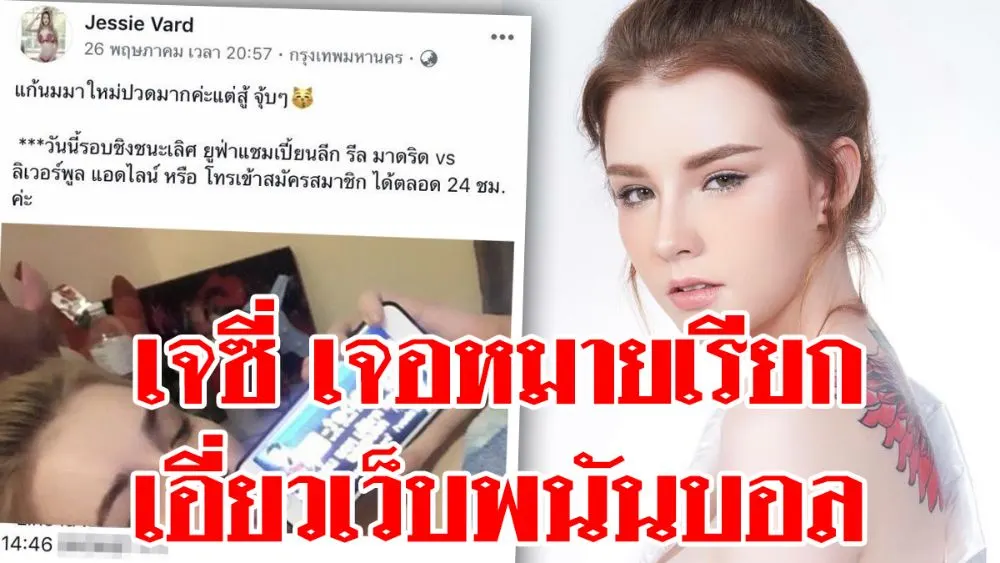 14 มิ.ย.2561 เจสซี่ วาร์ด เน็ตไอดอล สุดช็อก! เจอหมายเรียกเอี่ยวเว็บพนันบอล หลังรับงานโปรโมทให้เว็บพนันบอล เจ้าตัวเผย เป็นเพราะความซื่อของตนคิดว่าเป็นเว็บกีฬา โดยไม่รู้ว่าเป็นเว็บการพนันบอล หากรู้ว่าผิดกฎหมายก็จะไม่รับงาน เพราะทำให้ตัวเองเสียประวัติมาก และเตรียมเข้าพบเจ้าหน้าที่ตำรวจตามหมายเรียก ในวันที่ 20 มิถุนายนนี้ เพื่อยืนยันความบริสุทธิ์ใจ