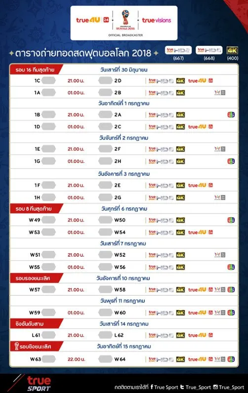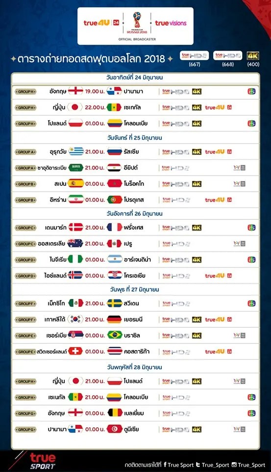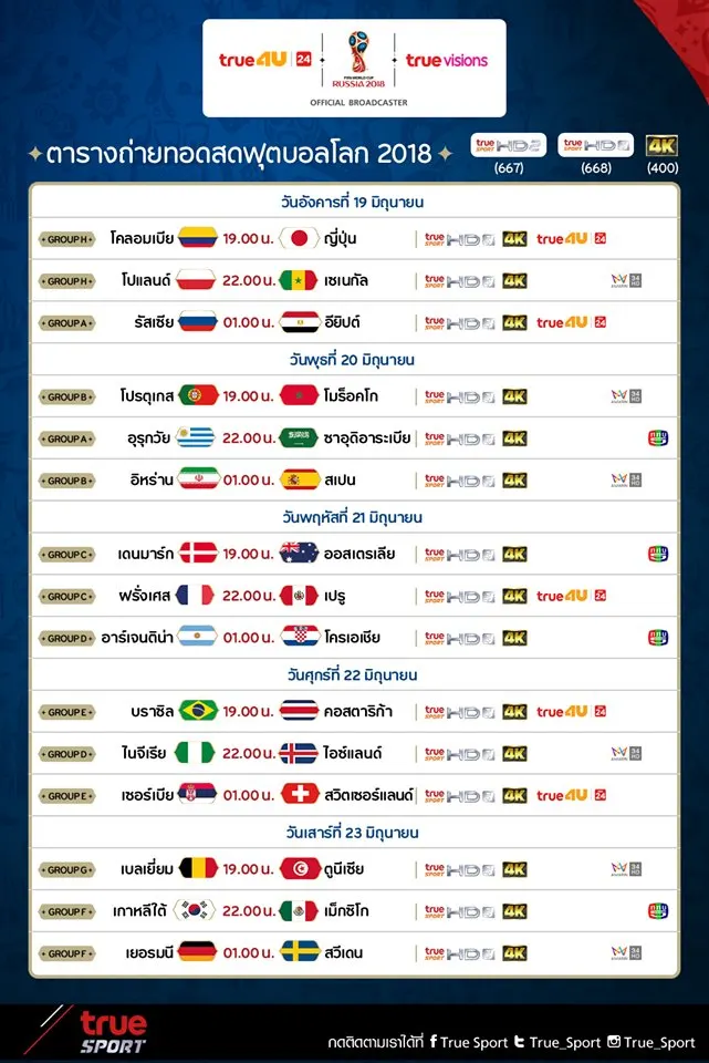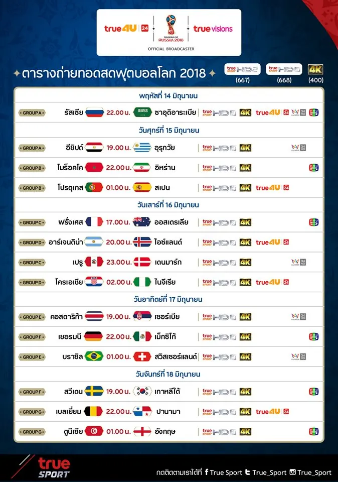 ตารางถ่ายทอดสด ฟุตบอลโลก 2018 ที่รัสเซีย เริ่มวันนี้ 14 มิ.ย.61 (วันแรก)