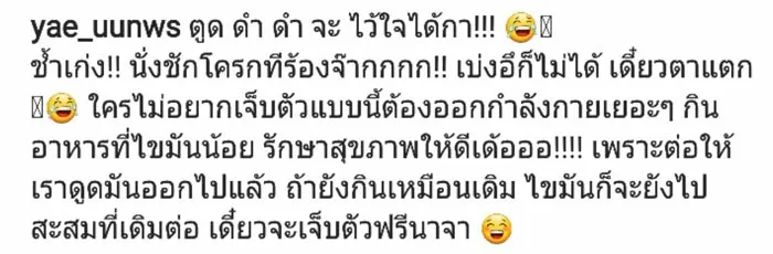 โดยโพสท์ข้อความ เผยเคล็ดลับตัวเเลตัวเองหลังจากศัลยกรรมระบุว่า ตูด ดำ ดำ จะ ไว้ใจได้กา!!! 😂🤣 ช้ำเก่ง!! นั่งชักโครกทีร้องจ๊ากกกก!! เบ่งอึก็ไม่ได้ เดี๋ยวตาแตก 🤣😂 ใครไม่อยากเจ็บตัวแบบนี้ต้องออกกำลังกายเยอะๆ กินอาหารที่ไขมันน้อย รักษาสุขภาพให้ดีเด้อออ!!!! เพราะต่อให้เราดูดมันออกไปแล้ว ถ้ายังกินเหมือนเดิม ไขมันก็จะยังไปสะสมที่เดิมต่อ เดี๋ยวจะเจ็บตัวฟรีนาจา