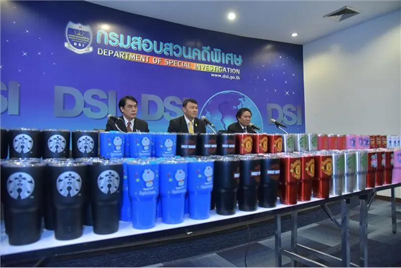 วันที่ 14 มิถุนายน 2561- พันตำรวจเอก ไพสิฐ วงศ์เมือง อธิบดีกรมสอบสวนคดีพิเศษ พันตำรวจตรี สุริยา สิงหกมล รองอธิบดีกรมสอบสวนคดีพิเศษ พร้อมด้วย พันเอก พินิจ ตั้งสกุล ผู้อำนวยการกองคดีทรัพย์สินทางปัญญา และตัวแทนบริษัทผู้เสียหาย ร่วมกันแถลงข่าวการบุกจับสินค้าประเภทแก้วน้ำปลอมเครื่องหมายการค้าและละเมิดลิขสิทธิ์หลายยี่ห้อ