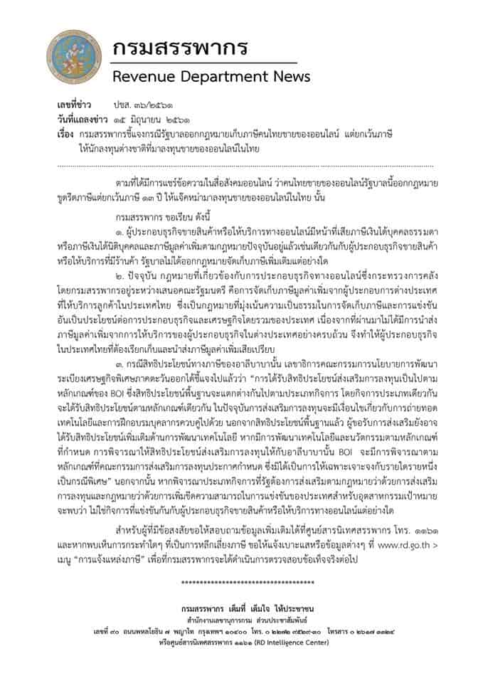 15 มิถุนายน 2561- กรมสรรพากรชี้แจงกรณีรัฐบาลออกกฎหมายเก็บภาษีคนไทยขายของออนไลน์ แต่ยกเว้นภาษีให้นักลงทุนต่างชาติที่มาลงทุนขายของออนไลน์ในไทย ' ไว้ว่า ตามที่ได้มีการแชร์ข้อความในสื่อสังคมออนไลน์ ว่าคนไทยขายของออนไลน์รัฐบาลนี้ออกกฎหมายขูดรีดภาษี แต่ยกเว้นภาษี 13 ปี ให้แจ๊คหม่ามาลงทุนขายของออนไลน์ในไทยนั้น สรุปประเด็นชี้แจงของกรมสรรพากรดังนี้