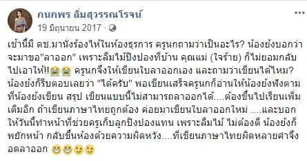 เมื่อวันที่ 19 มิถุนายน 2561 ผู้ใช้เฟซบุ๊กที่ชื่อว่า กนกพร ลิ่มสุวรรณโรจน์ ได้แชร์เรื่องราวสุดน่ารักของหนูน้อยคนหนึ่ง โดยระบุข้อความทั้งหมดเอาไว้ว่า