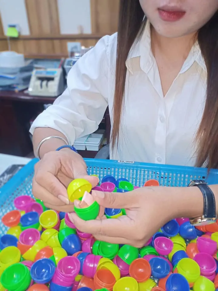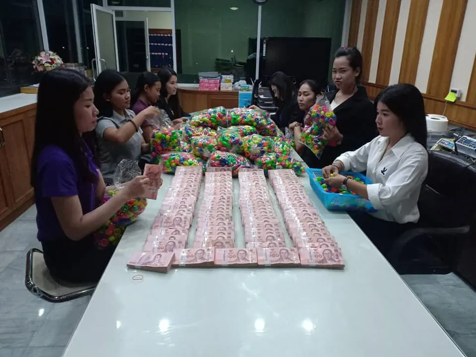"พนักงานกำลังเตรียมความพร้อม พับเงินใส่ลูกไข่ จำนวน 10000 ลูกเท่ากับ 1 ล้านบาท เพื่อให้นาคโปรยทาน เช้าวันที่ 23 ที่วัดโพธารามเวลา 9 นาฬิกา ขอเชิญทุกท่านร่วมงานนะครับ"