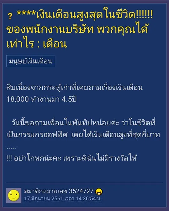 ในเว็บไซต์พันทิปก็มีคนมาตั้งกระทู้ถามถึง เงินเดือนที่สูงที่สุด ของคนวัยทำงานแต่ละคนว่าเท่าไหร่กันบ้าง ก็ถือเสียว่าเป็นการเปิดโลกก็แล้วกันนะ อย่าดราม่า…