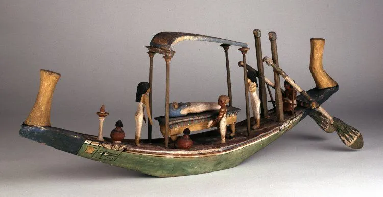 โมเดลเรือบางชนิดที่ชาวอียิปต์โบราณนิยมฝังเอาไว้ในสุสานมักจะเป็นโมเดลเรือที่แสดงให้เห็นถึงพิธีกรรมฝังศพของชาวไอยคุปต์ ที่เห็นได้ชัดเจนก็เช่นโมเดลจากสุสานในสมัยราชอาณาจักรกลาง ที่ในปัจจุบันเก็บรักษาเอาไว้ในพิพิธภัณฑ์อังกฤษ และมีการนำเอาออกไปจัดแสดงยังประเทศต่างๆ เช่นล่าสุด ได้รับการนำออกไปจัดแสดงในงานนิทรรศการเกี่ยวกับมัมมี่อียิปต์โบราณที่ฮ่องกงและไต้หวัน โมเดลเรือลำนี้แสดงให้เห็นส่วนหนึ่งของการเคลื่อนย้ายศพระหว่างพิธีกรรมฝังศพ บนเรือมีปะรำขนาดใหญ่ ภายในปะรำมีเตียงตั้งอยู่ บนเตียงคือมัมมี่ที่นอนอยู่อย่างสงบ บริเวณหัวเตียงและปลายเตียงปรากฏภาพสตรีสองนางอยู่ในท่าทางของความเศร้าโศก นักอียิปต์วิทยาทราบว่าสตรีสองนางนี้คือ “นางร้องไห้” (Mourners) ซึ่งมีบทบาทเป็นอย่างมากในงานศพของชาวไอยคุปต์ และที่ยืนอยู่ข้างเตียงคือนักบวชที่คอยอ่านคัมภีร์เพื่อสวดส่งวิญญาณของผู้วายชนม์ให้เดินทางไปยังปรโลกอย่างปลอดภัย