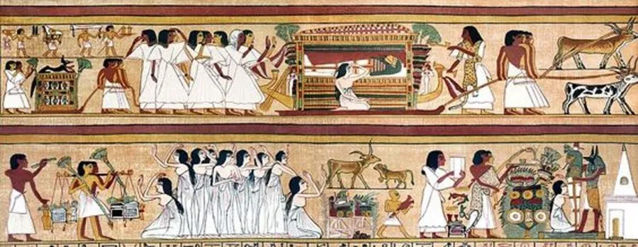 ภาพจากกระดาษปาปิรัสแสดงให้เห็นขบวนพิธีศพของชาวไอยคุปต์ประกอบไปด้วยวัวลากจูงโลงศพ นางร้องไห้