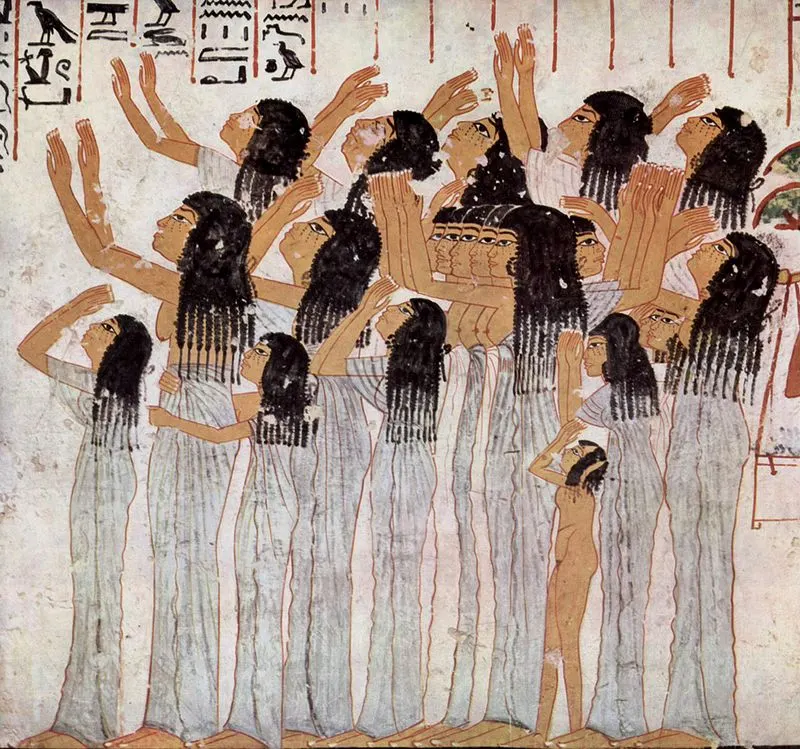 ภาพนางร้องไห้จากสุสานของราโมสแสดงให้เห็นกลุ่มของสตรีที่ยกมือชูขึ้น สื่อถึงความเสียใจต่อผู้วายชนม์ แต่ท่าทางการแสดงออก
