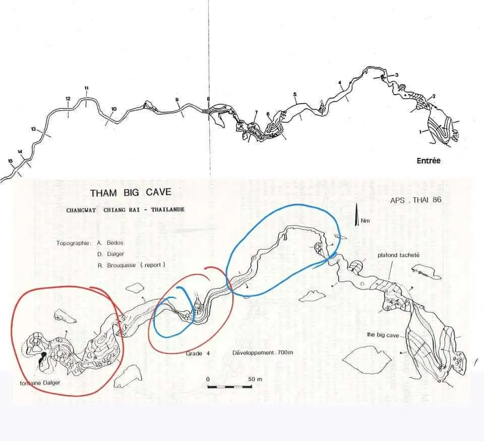 อีกอย่างในช่วงเวลานี้ ถ้าเด็ก ๆ ถอดรองเท้าและวางเป้ไว้ แสดงว่าพื้นถ้ำมีน้ำท่วมออกมาถึงด้านนอกแล้วแต่ยังไม่ลึกมาก นั่นหมายถึง Section ด้านในจะมีน้ำท่วมแล้ว มีโคลนมากเขาคงไม่เข้าไปลึกมากครับ อาจจะมีปัญหาเรื่องแสงสว่าง ไฟฉายดับ หรือไฟฉายมีน้อยเลยหาทางออกจากถ้ำไม่ได้และระดับน้ำขึ้นซะก่อน ส่วนอันตรายที่สุดสำหรับทีมดำน้ำที่จะดำเข้าไปเป็น Section แรกที่ผมวงสีน้ำเงินเอาไว้ เนื่องจากเส้นทางเข้าแคบต้องมุดเข้าไปและน้ำจะอัดผ่านช่องนี้ออกมา อันตรายสำหรับทีมที่ดำน้ำขาออกแต่ถ้าผ่านจุดนี้ไปได้แล้วเส้นทางด้านในจะกว้างขึ้นสามารถเดินได้ครับ ข้อมูลเผื่อทีมช่วยเหลือจะนำไปใช้ในการวางแผนได้นะครับ