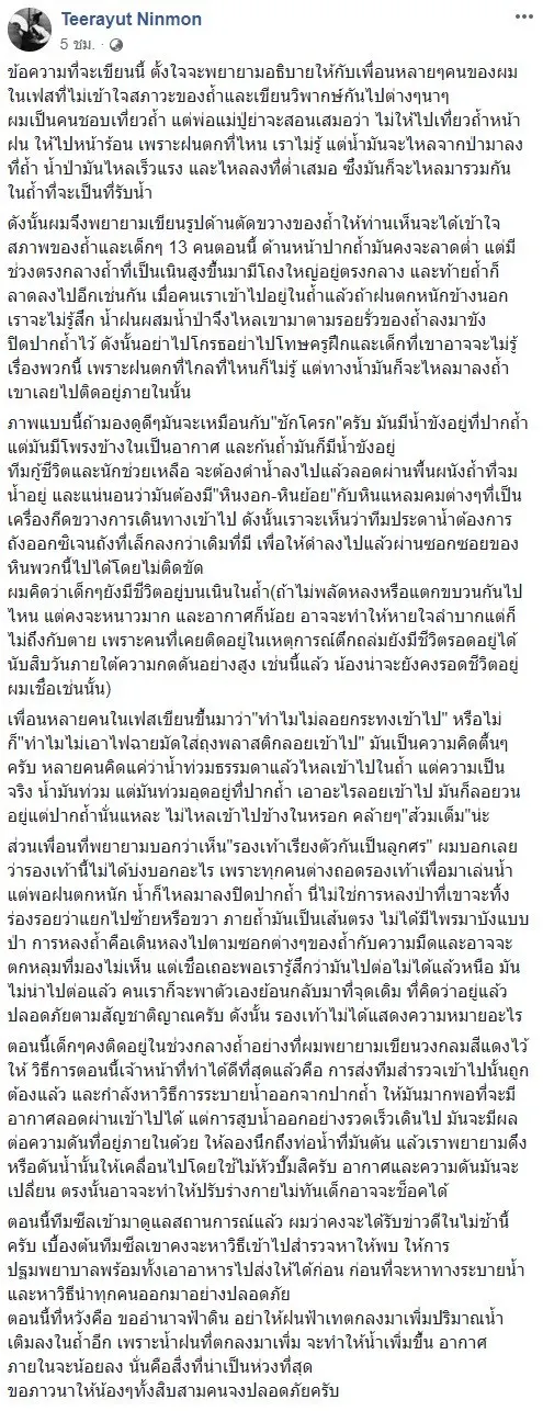 โดยได้โพสท์ระบุว่า ข้อความที่จะเขียนนี้ ตั้งใจจะพยายามอธิบายให้กับเพื่อนหลายๆคนของผมในเฟสที่ไม่เข้าใจสภาวะของถ้ำและเขียนวิพากษ์กันไปต่างๆนาๆ
