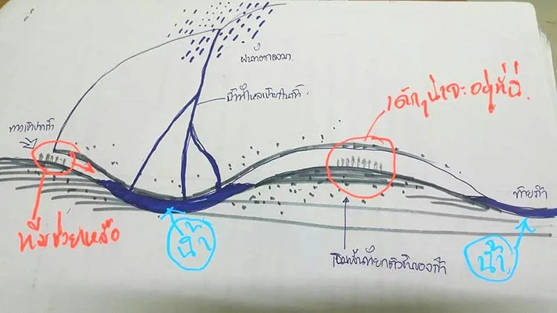 ดังนั้นผมจึงพยายามเขียนรูปด้านตัดขวางของถ้ำให้ท่านเห็นจะได้เข้าใจสภาพของถ้ำและเด็กๆ 13 คนตอนนี้ ด้านหน้าปากถ้ำมันคงจะลาดต่ำ แต่มีช่วงตรงกลางถ้ำที่เป็นเนินสูงขึ้นมามีโถงใหญ่อยู่ตรงกลาง และท้ายถ้ำก็ลาดลงไปอีกเช่นกัน เมื่อคนเราเข้าไปอยู่ในถ้ำแล้วถ้าฝนตกหนักข้างนอกเราจะไม่รู้สึก น้ำฝนผสมน้ำป่าจึงไหลเขามาตามรอยรั่วของถ้ำลงมาขังปิดปากถ้ำไว้ ดังนั้นอย่าไปโกรธอย่าไปโทษครูฝึกและเด็กที่เขาอาจจะไม่รู้เรื่องพวกนี้ เพราะฝนตกที่ไกลที่ไหนก็ไม่รู้ แต่ทางน้ำมันก็จะไหลมาลงถ้ำ เขาเลยไปติดอยู่ภายในนั้น