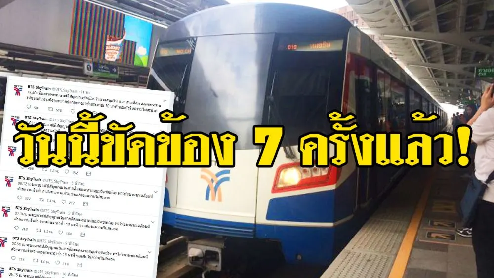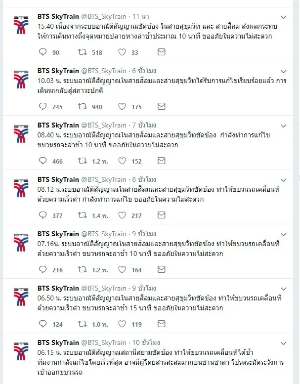 25 มิ.ย.2561 BTS อาการหนัก! ระบบสัญญาณอาณัติขัดข้อง เกือบตลอดทั้งวัน ตั้งแต่เช้า ล่าสุดเมื่อเวลาประมาณ บ่าย 3.40 ก็เกิดเหตุขัดข้องอีก รวมแล้ววันนี้ตลอดทั้งวันก็ปาเข้าไปแล้ว 7 ครั้ง
