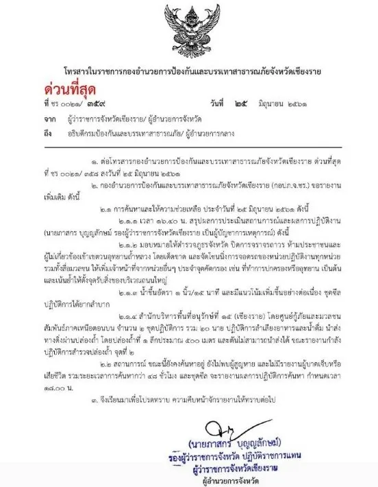 25 มิถุนายน 2561 ผู้ว่าราชการจังหวัดเชียงราย มีคำสั่งด่วน ถึง อธิบดีกรมป้องกันและบรรเทาสาธารณภัย / ผู้อำนวยการกลาง โดยมีใจความสำคัญดังนี้
