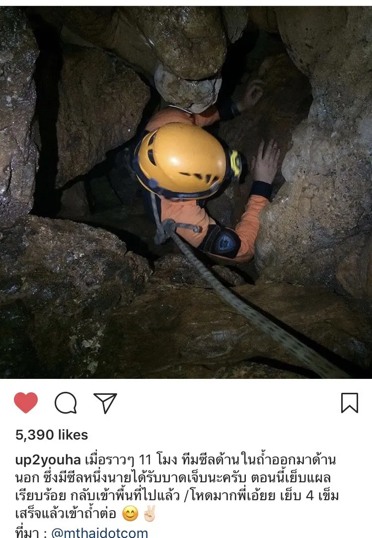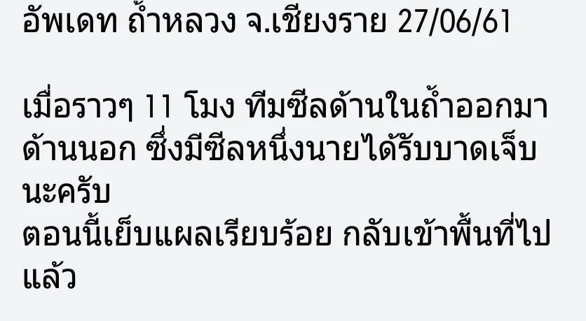 รายงานความคืบหน้า เมื่อเวลา 11.00 น. เจ้าหน้าที่ซีลบาดเจ็บ 1นาย ต้องออกมานอกถ้ำเพื่อเย็บแผล 4 เข็ม หลังจากนั้นก็เข้าไปในถ้ำเพื่อค้นหาน้องๆให้เจอให้ได้ น้องๆต้องรอดและต้องกลับมาด้วยกัน.. ทำงานแข่งกับ “เวลา” ทำงานแข่งกับ “ธรรมชาติ” ทำงานแข่งกับ “13ชีวิตที่ต้องรอด”