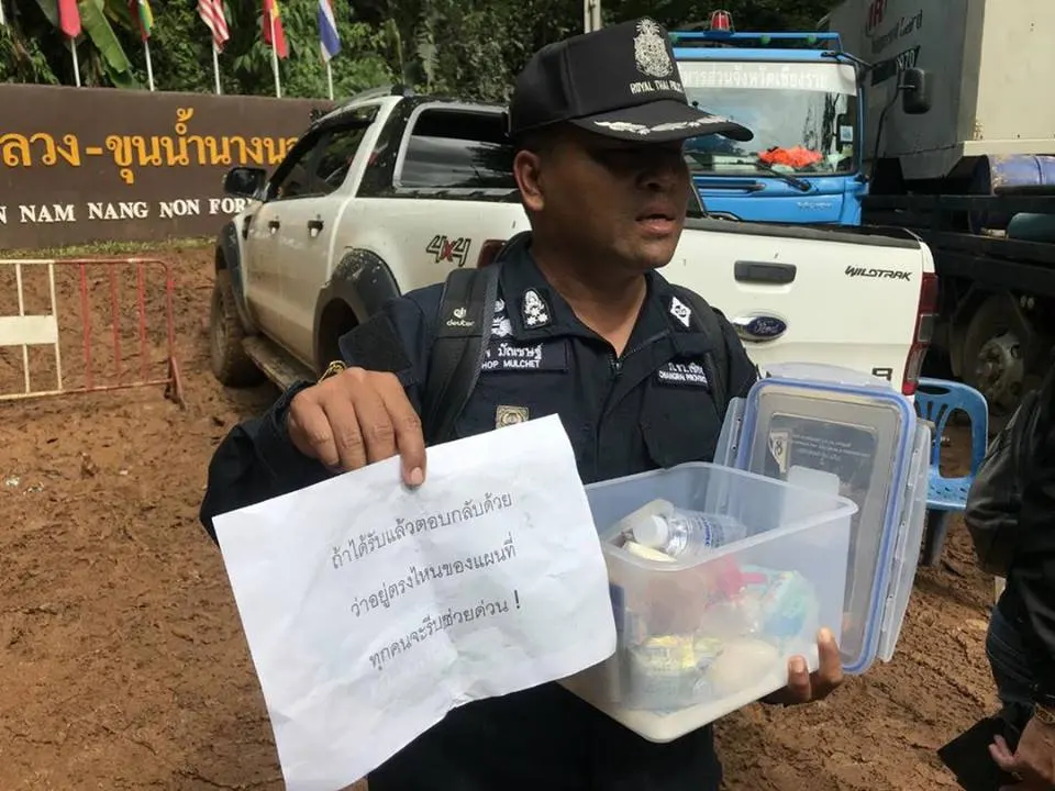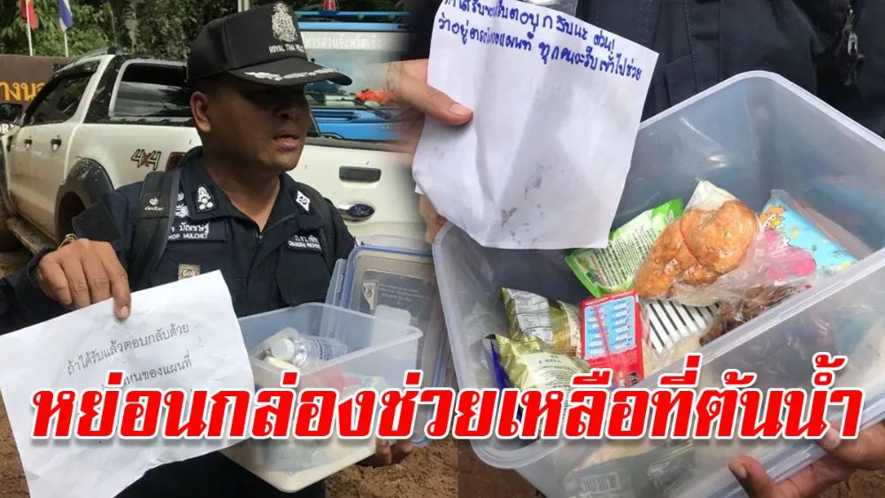 พล.ต.ท.ไกรบุญ ทรวดทรง ผู้บัญชาการ สำนักงานยุทธศาสตร์ตำรวจ เปิดเผยตอนนี้ได้หย่อนกล่องช่วยเหลือ 20 กล่องลงไปในปล่องถ้ำต้นน้ำให้ลอยตามกระแสน้ำ โดยมีแผนที่มาร์คจุด เพื่อให้ลอยน้ำออกมาเพื่อจะช่วยเหลือให้ตรงจุด (09.50 น.)