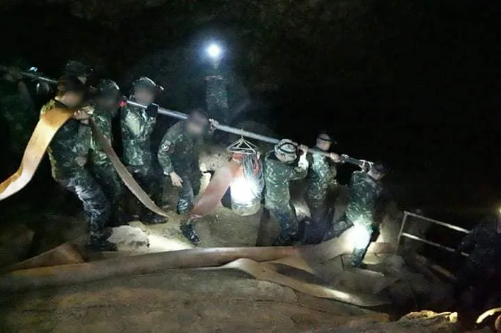 กำลังพลจากกองทัพบก หน่วยซีล กองทัพเรือ ช่วยกันลำเลียงเครื่องสูบน้ำ เข้าไปวางในถ้ำ เร่งดึงน้ำออกจากถ้ำให้เร็วที่สุด