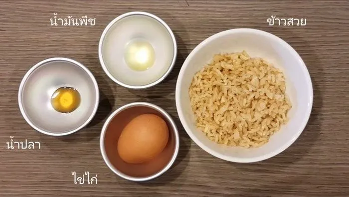 1. ตอกไข่ใส่ในข้าว คนให้เข้ากัน