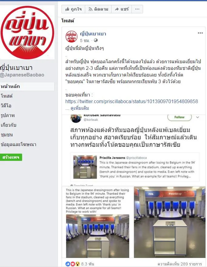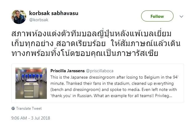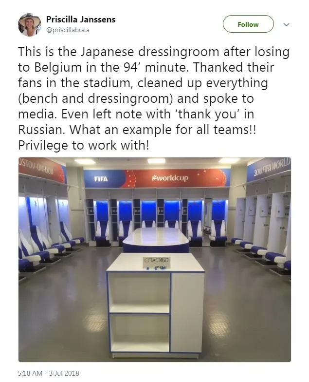 สำหรับญี่ปุ่น ฟุตบอลโลกครั้งนี้ได้จบลงไปแล้ว ด้วยการแพ้เบลเยี่ยมไปอย่างสนุก 2-3 เมื่อคืน แต่ภาพที่เห็นนี้เป็นห้องแต่งตัวของทีมชาติญี่ปุ่นหลังแข่งเสร็จ พวกเขาเก็บกวาดให้เรียบร้อยเลย ทั้งยังทิ้งโน้ต "ขอบคุณ" ในภาษารัสเซีย พร้อมนกกระเรียนพับ 3 ตัวไว้ด้วย
