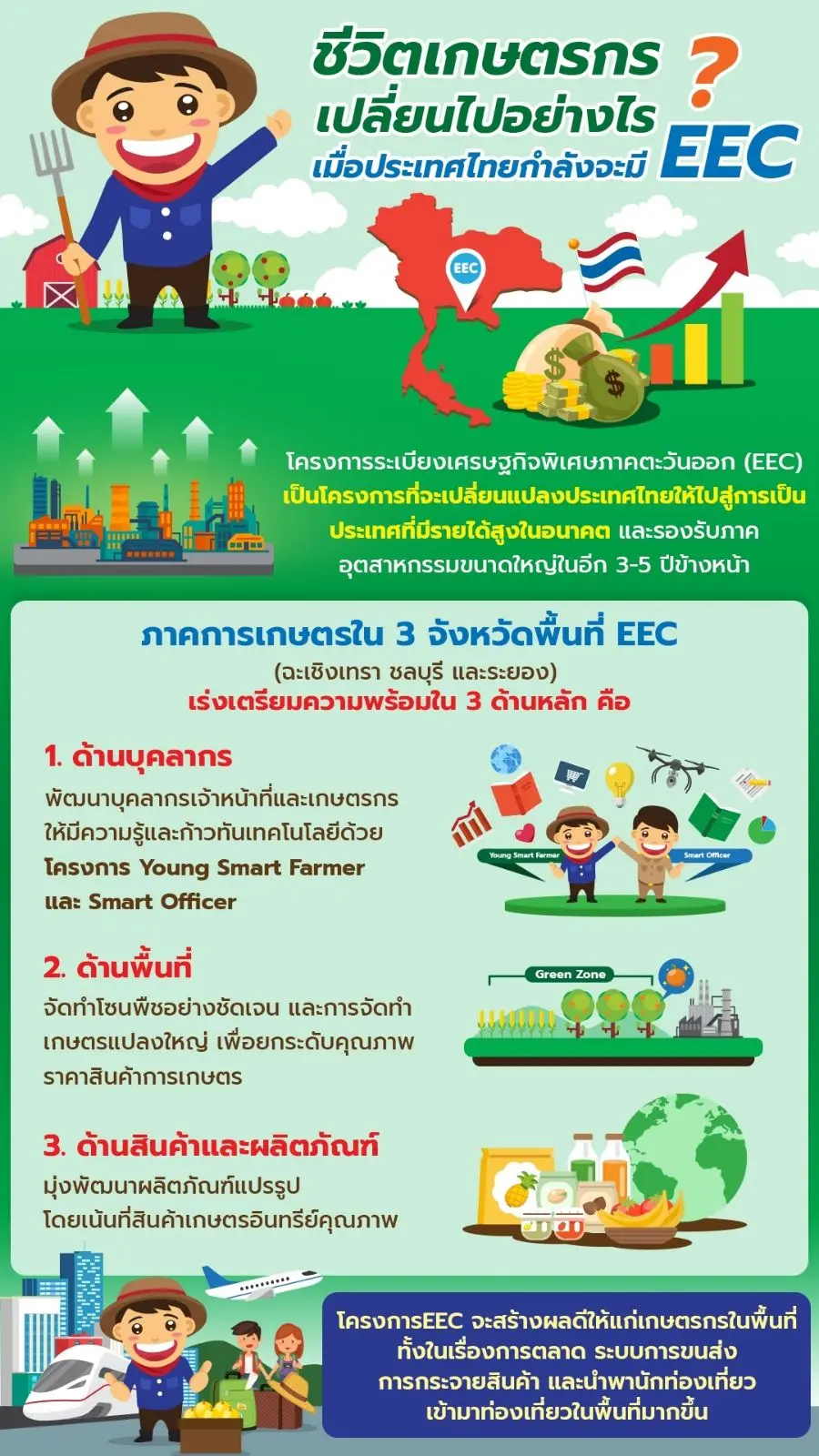 สำหรับเมกะโปรเจกต์ของรัฐบาลที่มุ่งยกระดับเศรษฐกิจของประเทศนั้น หนึ่งในโครงการที่มีความโดดเด่นคือ “การพัฒนาระเบียงเศรษฐกิจภาคตะวันออก” หรือ Eastern Economic Corridor (EEC) ซึ่งเป็นการพัฒนาพื้นที่บริเวณชายฝั่งตะวันออกให้เป็นเขตเศรษฐกิจชั้นนำของอาเซียนและเป็นเมืองที่น่าอยู่ พร้อมทั้งลงทุนในอุตสาหกรรมเป้าหมายใหม่ หรือ S-Curve โดยคณะรัฐมนตรีได้เห็นชอบร่าง พ.ร.บ.การพัฒนาพื้นที่เขตเศรษฐกิจพิเศษภาคตะวันออกใน 3 จังหวัด ได้แก่ ชลบุรี ระยอง และฉะเชิงเทรา สำหรับกลุ่มเกษตรกรในพื้นที่จะได้รับผลพลอยได้จากการเข้ามาของ EEC ในหลายๆด้าน