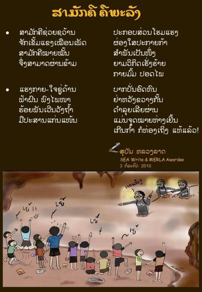 สุบัน หลวงลาด กวีซีไรต์ สปป.ลาว เขียนบทกวีชื่อ'สามัคคีคือพลัง'ชื่นชมคนไทยที่ร่วมแรงร่วมใจกันช่วยเหลือ 13 ชีวิตเด็กและโค้ชทีมหมูป่าที่ติดถ้ำหลวง ขุนน้ำนางนอนกว่า 10 วัน