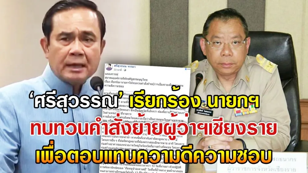 ศรีสุวรรณ เรียกร้องนายกฯ ให้ทบทวนคำสั่งย้ายผู้ว่าฯเชียงราย เพื่อตอบแทนความดีความชอบ