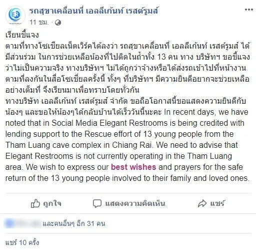 รถสุขาเคลื่อนที่ฯ ชี้แจงไม่ได้เข้าร่วมภารกิจที่ถ้ำหลวงฯ แต่ถูกแอบอ้างใช้ภาพโพสท์ลงเฟซบุ๊ค