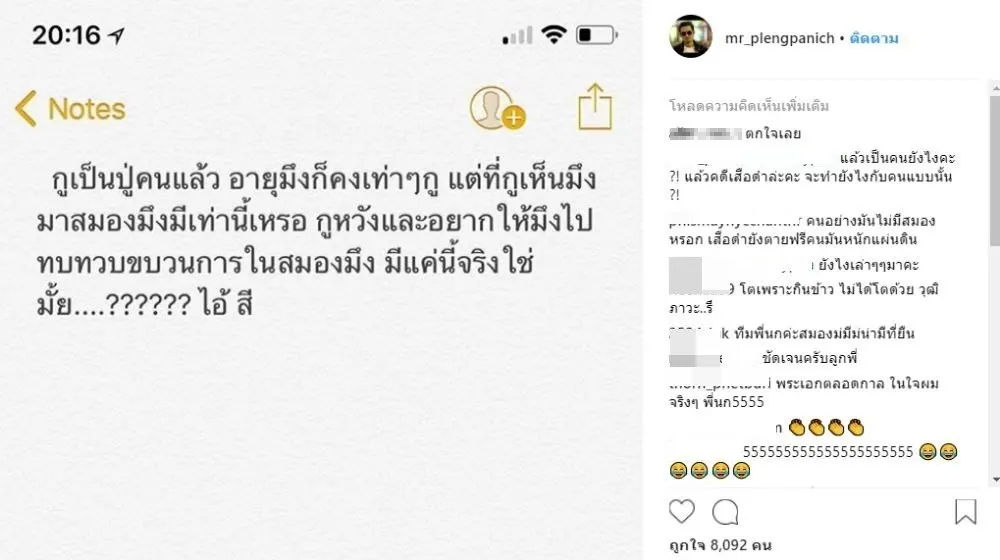 เมื่อวันที่ 3 ก.ค. 2561 (วานนี้) นก ฉัตรชัย เปล่งพานิช ดารานักแสดงชาย รุ่นใหญ่ชื่อดัง โพสต์ IG เดือด!! ระบุว่า "_ ูเป็นปู่คนแล้ว อายุมึ..ง ก็คงเท่าๆ_ู แต่ที่_ูเห็นมา สมองมึ...งมีเท่านี้เหรอ _ูหวังและอยากให้มึ...งไปทบทวนขบวนการในสมองมึ...ง มีแต่นี้จริงใช่ไหม????? " ไอ้ สี