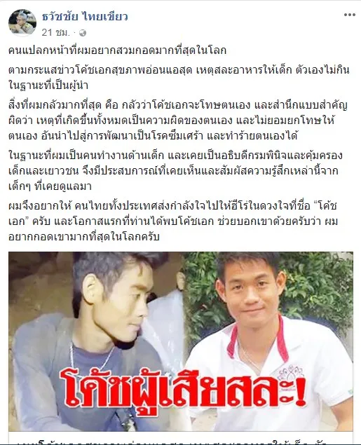 โดยได้โพสท์ระบุว่า "คนแปลกหน้าที่ผมอยากสวมกอดมากที่สุดในโลก" ตามกระแสข่าวโค้ชเอกสุขภาพอ่อนแอสุด เหตุสละอาหารให้เด็กตัวเองไม่กินในฐานะที่เป็นผู้นำสิ่งที่ผมกลัวมากที่สุด คือ กลัวว่าโค้ชเอกจะโทษตนเอง
