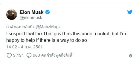 "ผมคิดว่ารัฐบาลไทยควบคุมสถานการณ์เรื่องนี้ไว้ได้แล้ว แต่ผมยินดีจะช่วยหากมีหนทางที่ผมทำได้" นายมัสก์ทวีตตอบกลับ