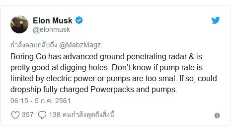 นายมัสก์จึงทวีตตอบกลับอีกครั้งว่า บริษัท บอร์ริง คอมพานี ของเขา มีเรดาร์ส่องทะลุผิวดินชั้นสูง และมีความถนัดในด้านการขุดเจาะพื้นดิน