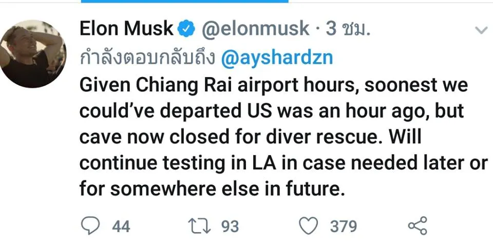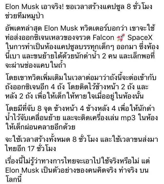 ล่าสุดมีการเผยภาพที่คาดว่าน่าจะเป็นแคปซูนที่ Elon Musk ส่งมาช่วยเด็กทั้ง 13 ชีวิตทีมหมูป่า